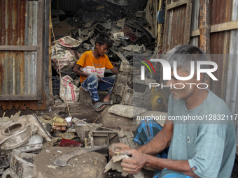 A child laborer works in a plastic recycling factory under unsafe and unsanitary conditions in Bangladesh on October 5, 2025.