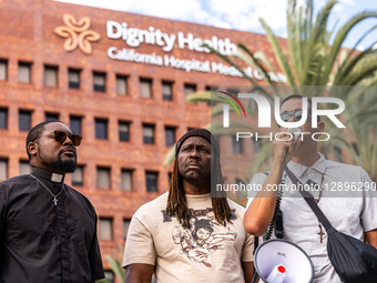 Pastor Eddie Anderson and Pastor Cue Jn-marie from CLUE, as well as SEIU 721 organizer Felipe S. Caceres, speak outside of Dignity Health, California Hospital Medical Center, where Carlitos Ricardo Parias, known as ''Richard LA,'' is treated after a federal immigration agent shoots him outside Santee Education Complex in Los Angeles, CA, on October 21, 2025.