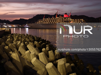 A view of a cruise ship at the Port Sultan Qaboos and breakwalls at the Mutrah Corniche in Muscat, Oman on December 2, 2025.