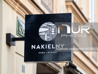 The Nakielny Kawa i Wypieki cafe logo sign is seen in Krakow, Poland, on November 28, 2025. The coffeehouse and confectionery offers cookies, tarts, and cakes in Krakow. The signage displays the brand logotype.
