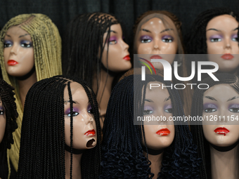EDMONTON, CANADA - JULY 21: A stand featuring a variety of peruques is seen on display during the KDays festival in Edmonton, Alberta, Canada, on July 21, 2025.