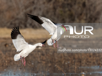 Snow geese come to a landing at Bosque del Apache National Wildlife Refuge near San Antonio, New Mexico. The refuge's wetlands serve as a critical resting and feeding stop for thousands of cranes, geese, and other migratory birds moving along the Rio Grande corridor. Wildlife watchers and photographers gather each year to witness the spectacle as the birds arrive in the early morning light and settle in for the winter season.