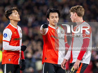 Feyenoord player Ayase Ueda argues with Feyenoord player Thijs Kraaijeveld during the match Feyenoord vs PEC Zwolle at the Stadion de Kuip for the Dutch Vriendenloterij Eredivisie season 2025-2026 in Rotterdam, Netherlands, on November 9, 2025.