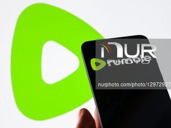 The Rumble Ink logo is displayed on a mobile phone with the company branding icon seen in the background in this photo illustration in Brussels, Belgium, on November 9, 2025.