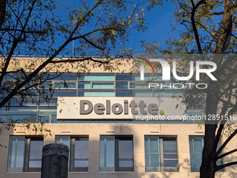 The Deloitte office building displays the company's logo on the facade in Munich, Bavaria, Germany, on October 21, 2025. Deloitte is one of the world's largest professional services networks, providing audit, consulting, tax, and advisory services to global and regional clients.