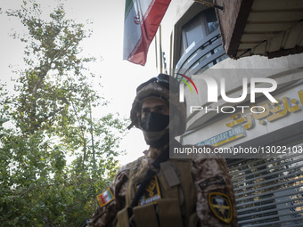 An armed personnel of the Islamic Revolutionary Guard Corps (IRGC) monitors an area while standing under a country flag during a funeral for unknown martyrs from the Iran-Iraq War (1980-1988) in Tehran, Iran, on November 24, 2025.