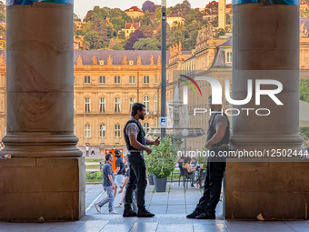 Security personnel patrol and observe the area around Koenigspassage and Schlossplatz in Stuttgart, Baden-Wuerttemberg, Germany, on June 20, 2025. The officers station near the New Palace (Neues Schloss), where crowds gather in the evening for leisure.