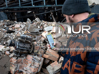A man photographs the engine of a UAV used by Russian forces to attack the city's railway infrastructure in Fastiv, Kyiv region, Ukraine, on December 10, 2025. On the night of December 5-6, Russian forces launch a major air attack with missiles and drones, resulting in fires and destruction at the Fastiv railway station and the motor-car depot