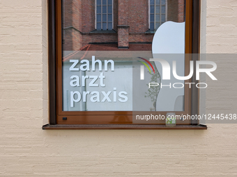 A window with signage reading ''zahnarzt praxis'' (dentist's office) is on the facade of a dental practice, with a jar placed on the window sill in Straubing, Lower Bavaria, Bavaria, Germany, on April 26, 2025. The reflection of a church building is visible in the glass, blending modern healthcare signage with historical architecture.