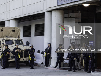 DHS guards the entrance to Metropolitan Detention Center next to the ''Ice Out of LA'' Press Conference and Rally in Los Angeles, CA, on July 7, 2025.