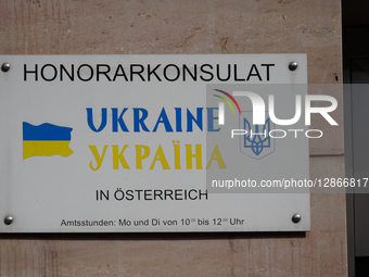 A sign indicates the Honorary Consulate of Ukraine with the national flag and coat of arms on a wall in Salzburg, Austria, on March 5, 2022.