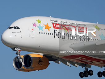 An Emirates Airbus A380 with a special Emirates Airline Foundation livery lands in Barcelona