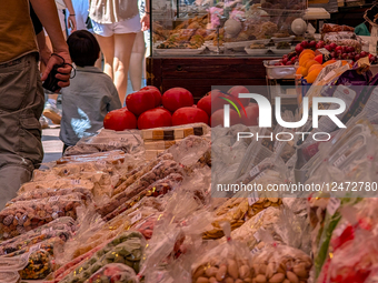 Packaged dried fruits, nuts, sweets, and fresh produce are displayed for sale at an outdoor market stand in Vienna, Austria, on June 10, 2025. Several people pass through the narrow aisle in warm weather.