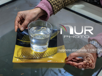 An employee of the Jal Jeevan Mission scheme is holding the first fresh glass of water as the village of Matipora in Baramulla receives a drinking water scheme for the first time since independence, in Baramulla, Jammu and Kashmir, India, on March 11, 2024.
