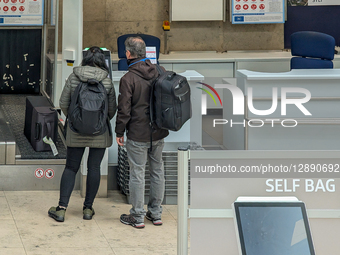 Passengers use the self bag drop system at Albrecht Durer Airport Nuremberg in Nuremberg, Franconia, Middle Franconia, Bavaria, Germany, on October 19, 2025. The automated system allows travelers to check in and deposit their luggage independently, improving efficiency and reducing waiting times at the airport.