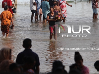 Displaced residents take shelter in makeshift tents made of sarees and colorful sheets pitched on an embankment under a main road flyover bridge in Colombo, Sri Lanka, on December 1, 2025. The Disaster Management Center confirms that the death toll from adverse weather caused by Cyclone Ditwah rises to 366, with more than 1.1 million people affected nationwide.