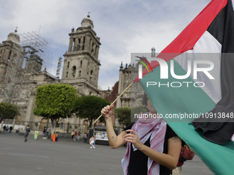 Members of the Palestinian community and various social and political organizations are holding a flag in the Zocalo of Mexico City, on the occasion of the World Day of the Papalote in Solidarity with the Palestinian People. They are demanding a halt to the bombing that the Israeli army is carrying out in the Palestinian territories in the Gaza Strip following the attack by the Hamas group. More than 20,000 people have died and a large number of people have been wounded.