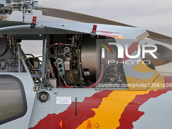 Part of the engine of a Eurocopter EC-120B Colibri helicopter of the Patrulla Aspa belonging to the Spanish Air Force parks at the Cuatro Vientos military base in Madrid, Spain, on October 11, 2025.