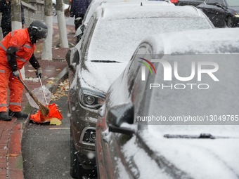 A sanitation worker cleans in the snow on the street in Yantai, Shandong Province, China, on December 2, 2025.