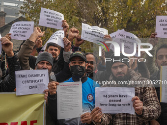Members of the All Jammu and Kashmir Association of the Deaf hold placards during a protest to mark the International Day of People with Disabilities in Srinagar, India, on December 3, 2025. The protesting members of AJKHA demand better living conditions and rights. The International Day of People with Disabilities is observed on December 3 every year.