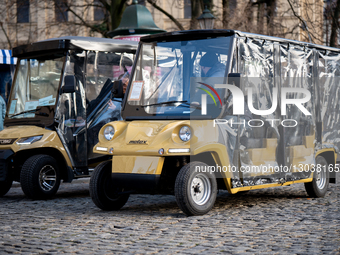 The Melex electric car is seen in Krakow, Poland, on November 28, 2025. This vehicle is used by a tour guide for a city sightseeing tour with audio commentary. It is a tourist attraction of Krakow.
