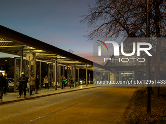 Commuters wait at the long, covered bus terminal outside the Klinikum Grosshadern metro station in Munich, Bavaria, Germany, on November 4, 2025. The terminal is illuminated in the evening.