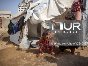 A Palestinian woman splashes water over her child amidst soaring temperatures in western Gaza City, on August 13, 2025, during a heatwave.
