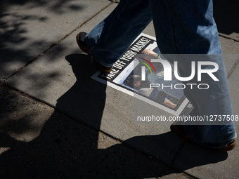 A pedestrian walks by a posters against masked federal agents on a downtown sidewalk, in Washington, D.C., U.S., on September 9, 2025. The signs criticize President Donald Trump’s surge of federal agents in the city, especially those evading public accountability by concealing their identities.