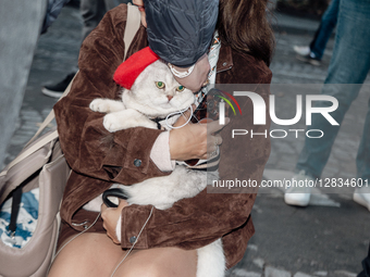 A cat takes part in the Animal Walk march on the Champs-Elysees in Paris, France, on October 5, 2025, celebrating the special bond between pets and their owners.