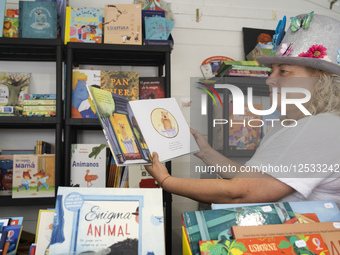 A young bookseller known as ''FELISA'' displays her children's books at one of the stands at the 44th Santander Book Fair in Santander, Spain.