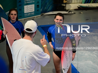 Surfers Eva Weiss and Lea Sasse compete in the women's category of the first international indoor surfing competition in Lyon, France, on November 8, 2025.