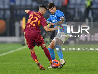Stephan El Shaarawy of A.S. Roma and Giovanni Di Lorenzo of S.S.C. Napoli are in action during the 13th day of the Serie A Championship between A.S. Roma and S.S.C. Napoli at the Olympic Stadium in Rome, Italy, on November 29, 2025.