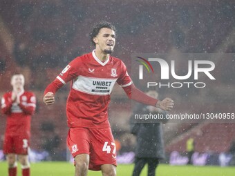 Archie Baptiste of Middlesbrough celebrates the win at the final whistle with the fans during the Sky Bet Championship match between Middlesbrough and Derby County at the Riverside Stadium in Middlesbrough, England, on November 29, 2025.