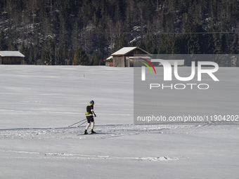 Skiers practice cross-country skiing on flat, snow-covered terrain in Krun, Garmisch-Partenkirchen, Upper Bavaria, Bavaria, Germany, on December 29, 2024. They perform skiing exercises on flat terrain in the Bavarian Werdenfelser Land.