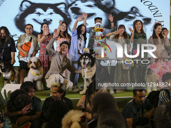 In South Tangerang, Banten, Indonesia, on October 31, 2025, the owner and the dog wear colorful costumes during a fashion show themed ''Garden Party.'' The event features dozens of pets and their owners showcasing coordinated outfits inspired by flowers and nature.