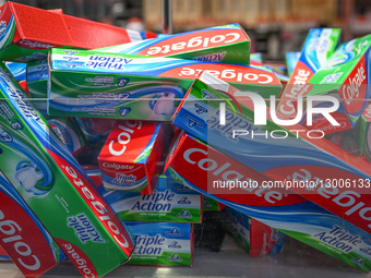 RZESZOW, POLAND – NOVEMBER 19: Triple Action Colgate toothpaste displayed in a shop window in Rzeszow, Poland, on November 19, 2025.