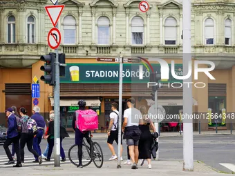 A Foodora bicycle courier waits at a traffic light alongside pedestrians in Budapest, Hungary, on May 20, 2023.