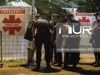 Police inspect a visitor for prohibited substances at the EXIT music festival on the grounds of the Petrovaradin Fortress in Serbia, on July 11, 2025.