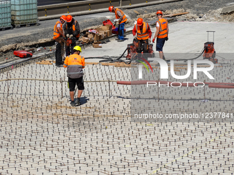 Construction workers operate heavy tools and position reinforcement materials on a concrete surface filled with dowel anchors at a construction site in Prague, Czech Republic, on May 12, 2025. The workers wear high-visibility vests and helmets while preparing the site for further structural development.