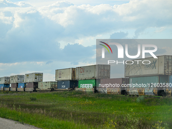 HOLDEN, CANADA - JULY 27: CN locomotive 3979 pulls a long freight train near the village of Holden, Alberta, Canada, on July 27, 2025.