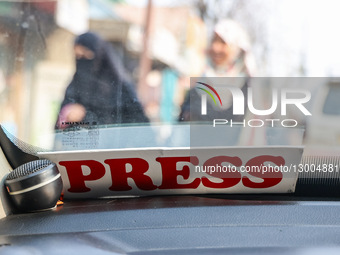 A press board is installed on the front glass of a journalist's car in Baramulla, Jammu and Kashmir, India, on November 18, 2025.