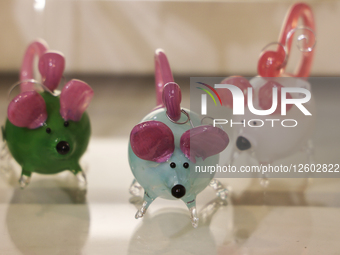 Figures of mice made out of glass are displayed at a glass workshop in Old Quebec City, Quebec, Canada, on June 26, 2025.
