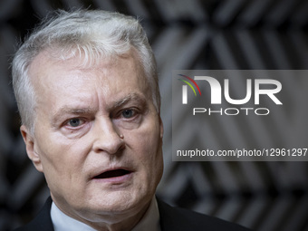 The President of Lithuania Gitanas Nauseda attends the European Council Summit and Euro Summit, the EU leaders meeting at the EU headquarters and does doorstep statement while answering questions from journalists of international media and press. Among the topics of the summit are European defense, support to Ukraine, the Middle East, migration, housing and competitiveness. Brussels, Belgium on October 23, 2025