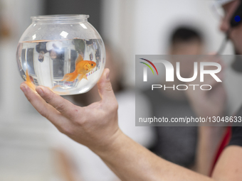 A goldfish swims in an aquarium during a children's party at a play center in Novi Sad, Serbia, on November 30, 2025.
