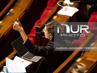Sandrine Runel, deputy of the Socialist Group and member of the NFP (New Popular Front), gives a thumbs up for a vote during the public debate on the 2026 Social Security Financing Bill (PLFSS 2026) at the National Assembly in Paris, France, on December 5, 2025.