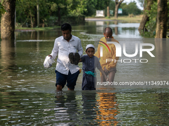 People are wading through floodwater in Gowainghat, Sylhet, Bangladesh, on Friday, June 21, 2024.