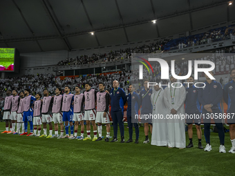 Julen Lopetegui, head coach of Qatar, his staff, and substitutes line up prior to the Group A FIFA Arab Cup 2025 match between Syria and Qatar at Khalifa International Stadium in Doha, Qatar, on December 4, 2025.
