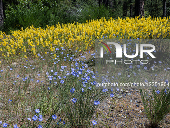 Perennial flax and golden lupine grow wild along a parking lot in Grass Valley, Calif., on May 7, 2025.