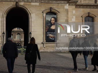 A banner withthe portrait of Mona Lisa is seen on the Louvre Museum facade in Paris, France on November 12th, 2025.