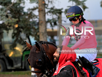 Jockey Fraser Aebly rides Long Acting to the track ahead of the seventh race at Woodbine Racetrack in Toronto, Canada, on November 23, 2025.